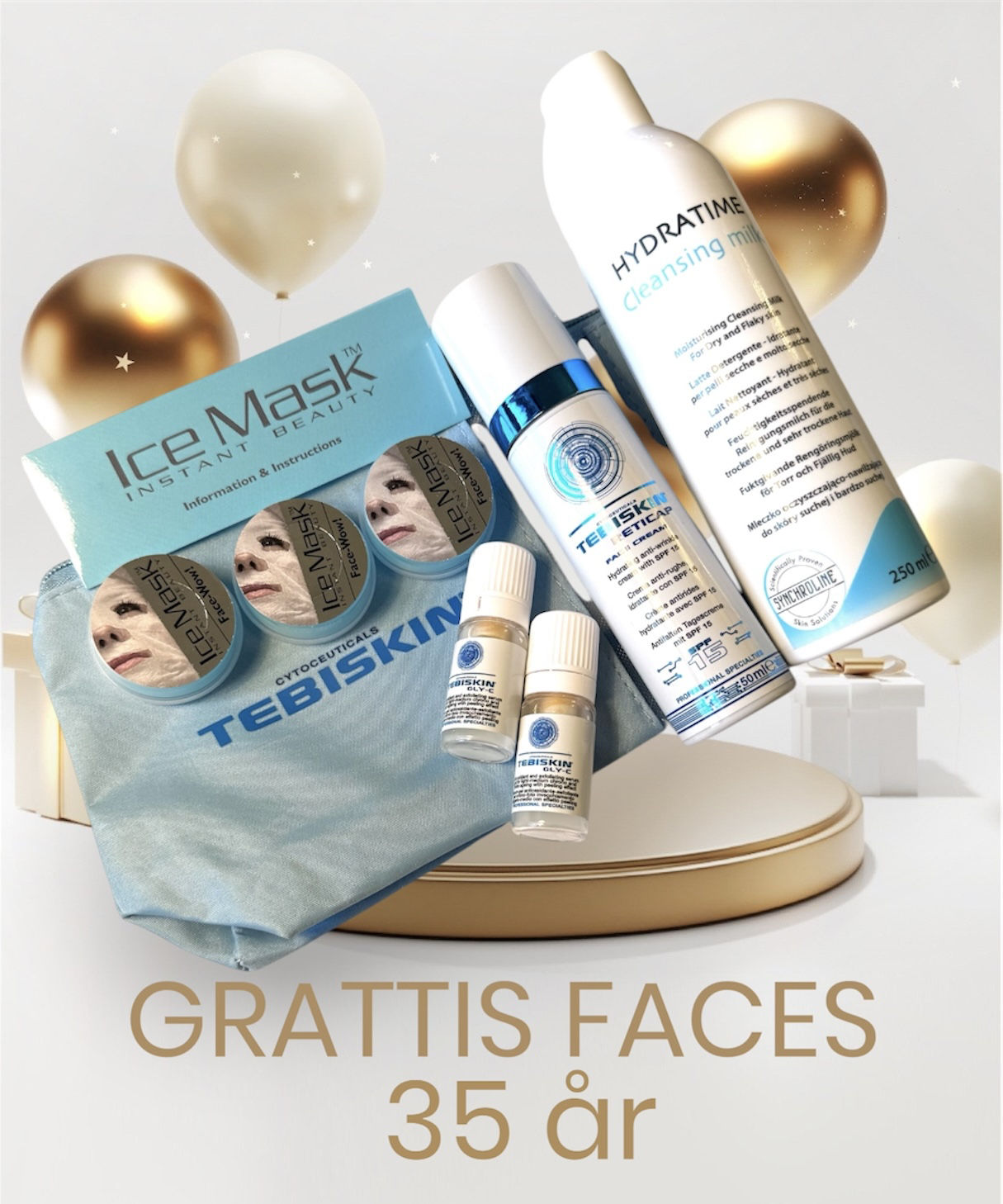 Starkt reducerat jubileumspaketet som firar FACES 35 år. Ett paket som speglar vår passion för Avancerad Hudvård. I paketet finns fuktgivande rengöring, Serum med AHA-syra och C-vitamin som exofolierar och tar fram hudens lyster. Rejuvenerande kräm med Retinol och IceMask "Face Wow" som ger huden en quick-fick.